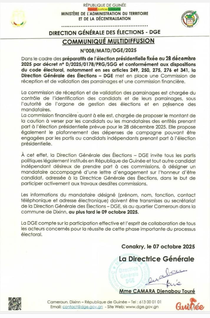 Dans le cadre des préparatifs de l’élection présidentielle fixée au 28 décembre 2025, et conformément aux dispositions du nouveau code électoral, la Direction Générale des Élections (DGE) a annoncé la mise en place d’une Commission de réception et de validation des parrainages ainsi qu’une commission financière.